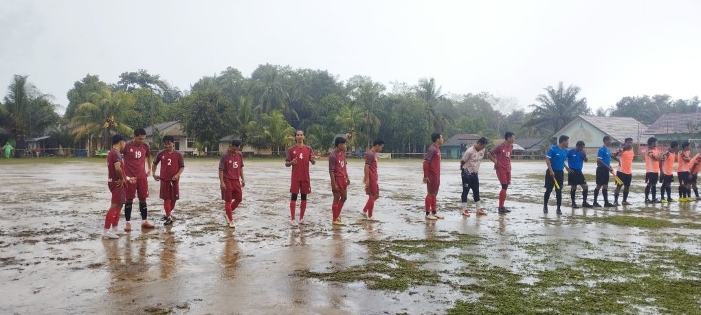 Dibawah cuaca hujan, dan lapangan tergenang air kedua tim bermain imbang tanpa gol pada babak pertama.