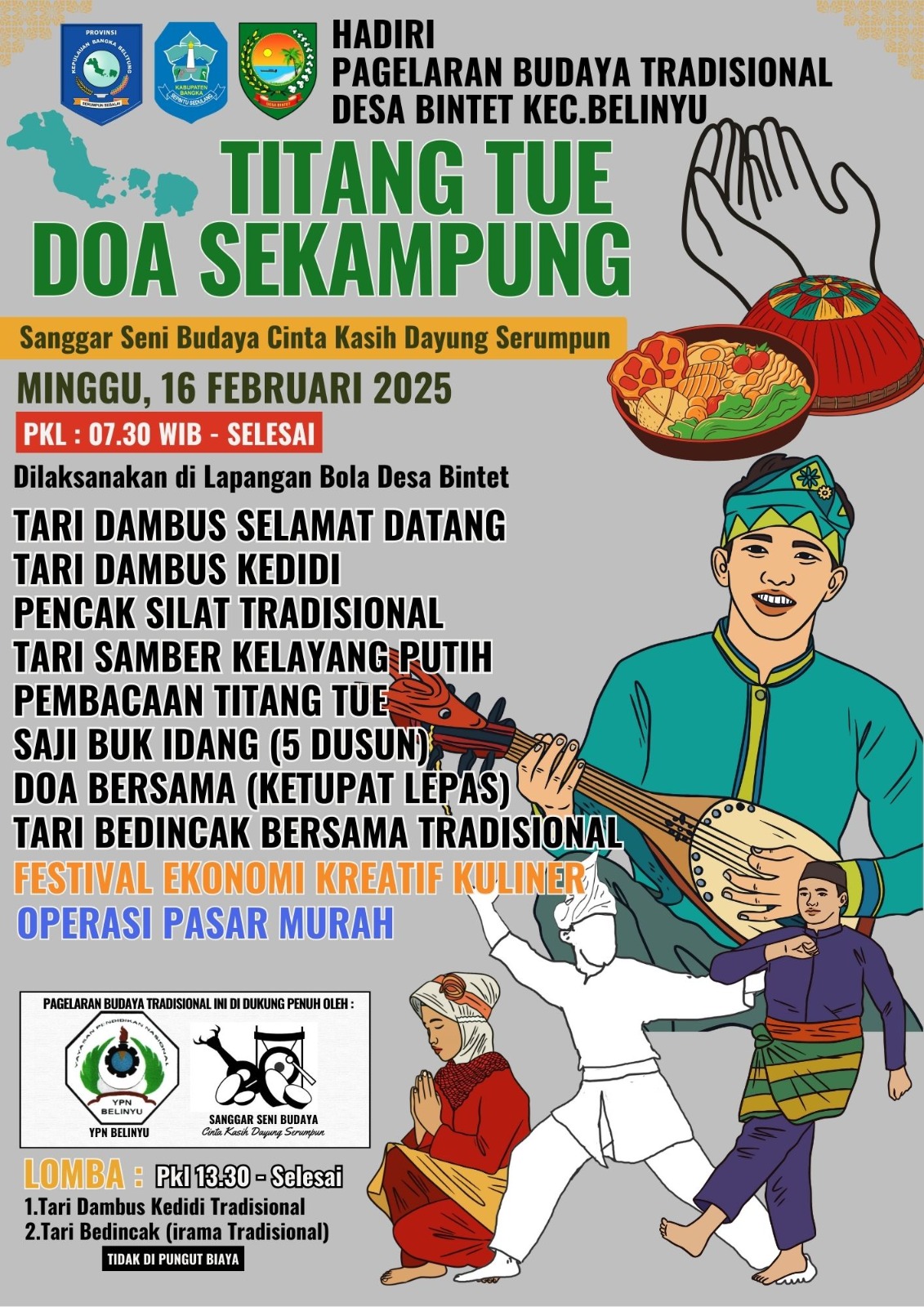 BANGKA – Masyarakat Desa Bintet, Kecamatan Belinyu akan menggelar tradisi yakni ‘Titang Tue’ atau istilahnya Doa Sekampong. Acara itu rencananya akan digelar pada Minggy (16/02/2026) di lapangan sepak bola Desa Bintet.