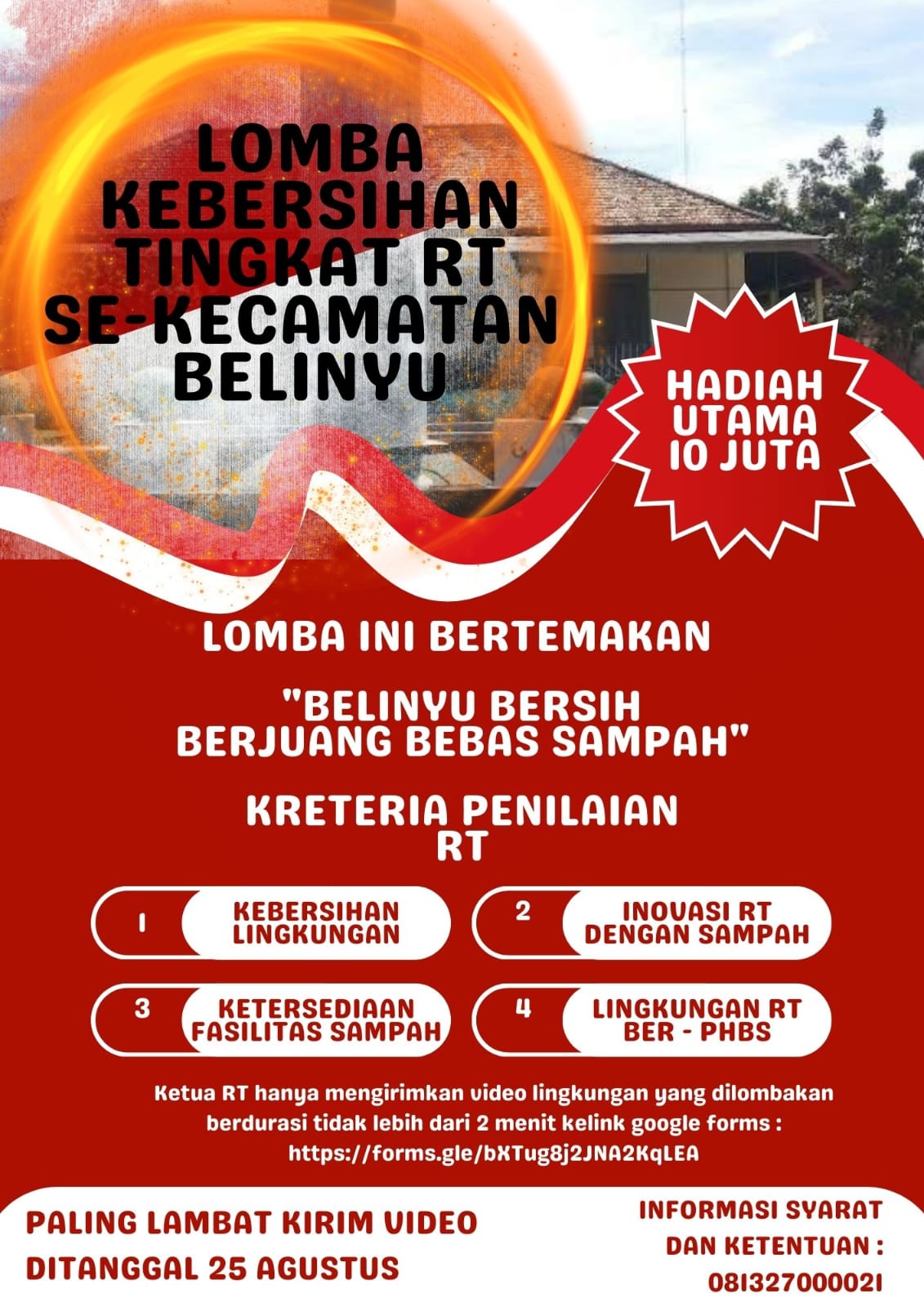 ” Iya, ada kegiatan lomba kebersihan. Syaratnya RT yang ada di wilayah Kecamatan Belinyu. Ketentuannya mengirimkan video minimal 1 menit, maksimal 2 menit. Video diambil dari gerbang atau batas RT, halaman, ruang dan fasilitas RT. Penilaian berdasarkan kebersihan lingkungan dan tingkat inovasi. RT yang punya nilai inovasi dapat nilai plus. Hasil video pemenang, resmi menjadi hak milik Kecamatan. Video dikirimkan ke link yang sudah disiapkan panitia,” ungkap Arif, Jum’at (09/08) pagi.