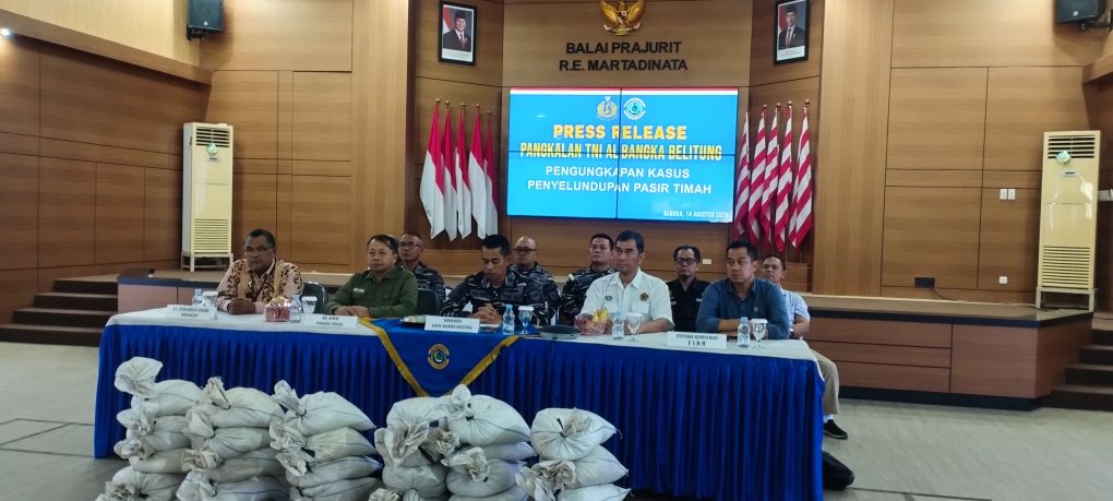 BANGKA – Pangkalan TNI Angkatan Laut Bangka Belitung, menggelar press release terkait pengungkapan kasus penyelundupan pasir timah yang berhasi diungkap oleh Tim Trisula Lanal Babel awal pekan lalu.