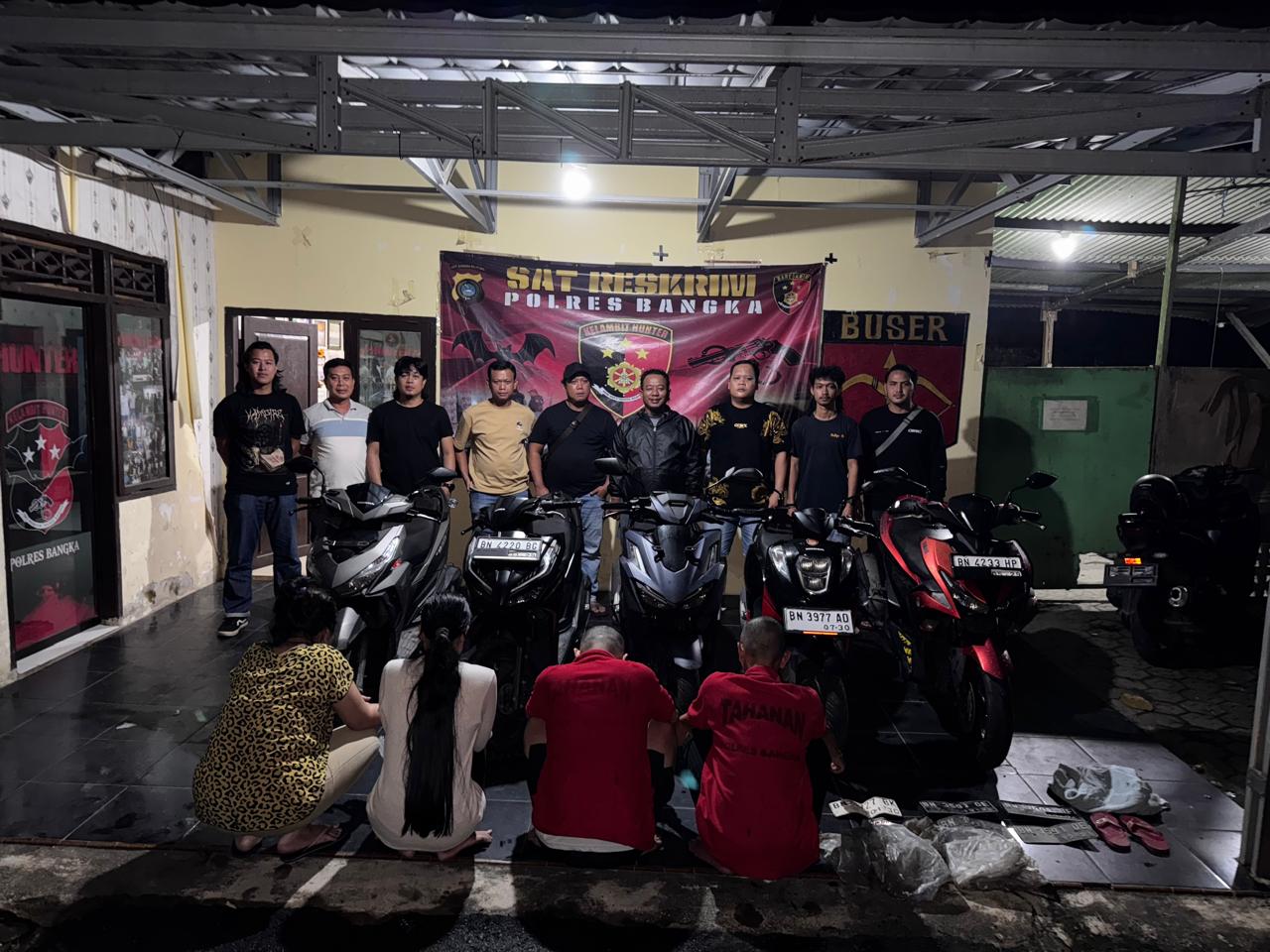 BANGKA – Dua pasangan suami istri diamankan tim opsnal Satresktrim Polres Bangka, Sabtu pekan lalu. Mereka masing-masing iisial Hn (33) dan Am (30) serta dua orang pria yakni Hr (35) dan Zk (37)