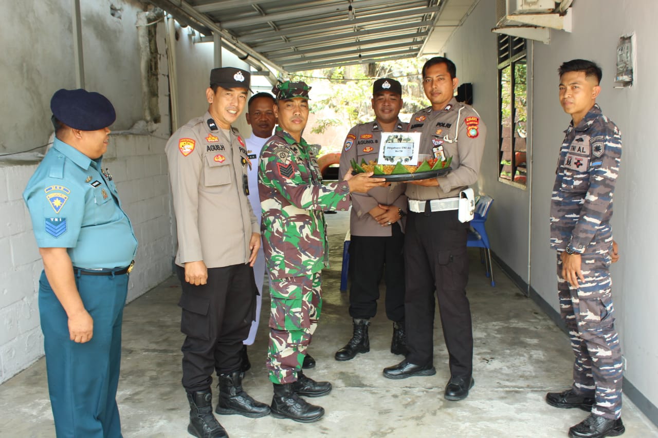 BANGKA — Sejumlah personel Polsek Belinyu mendatangi Posmat TNI Angkatan Laut Belinyu di Tanjung Gudang Belinyu, Senin (11/09) pagi. Kedatangan mereka adalah mengantar nasi tumpeng dalam rangka HUT TNI AL yang ke 78.
