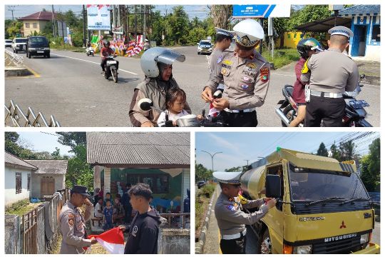 ” Sebagai wujud ajakan kepada masyarakat untuk mengibarkan bendera merah putih. Hari ini kami bagikan bendera kepada masyarakat di sekitar Kecamatan Riausilip. Mayoritas yang pengendara sepeda motor yang melintas,” kata Kapolsek Riausilip IPTU Gali Rakasiwi, mewakili Kapolres Bangka.