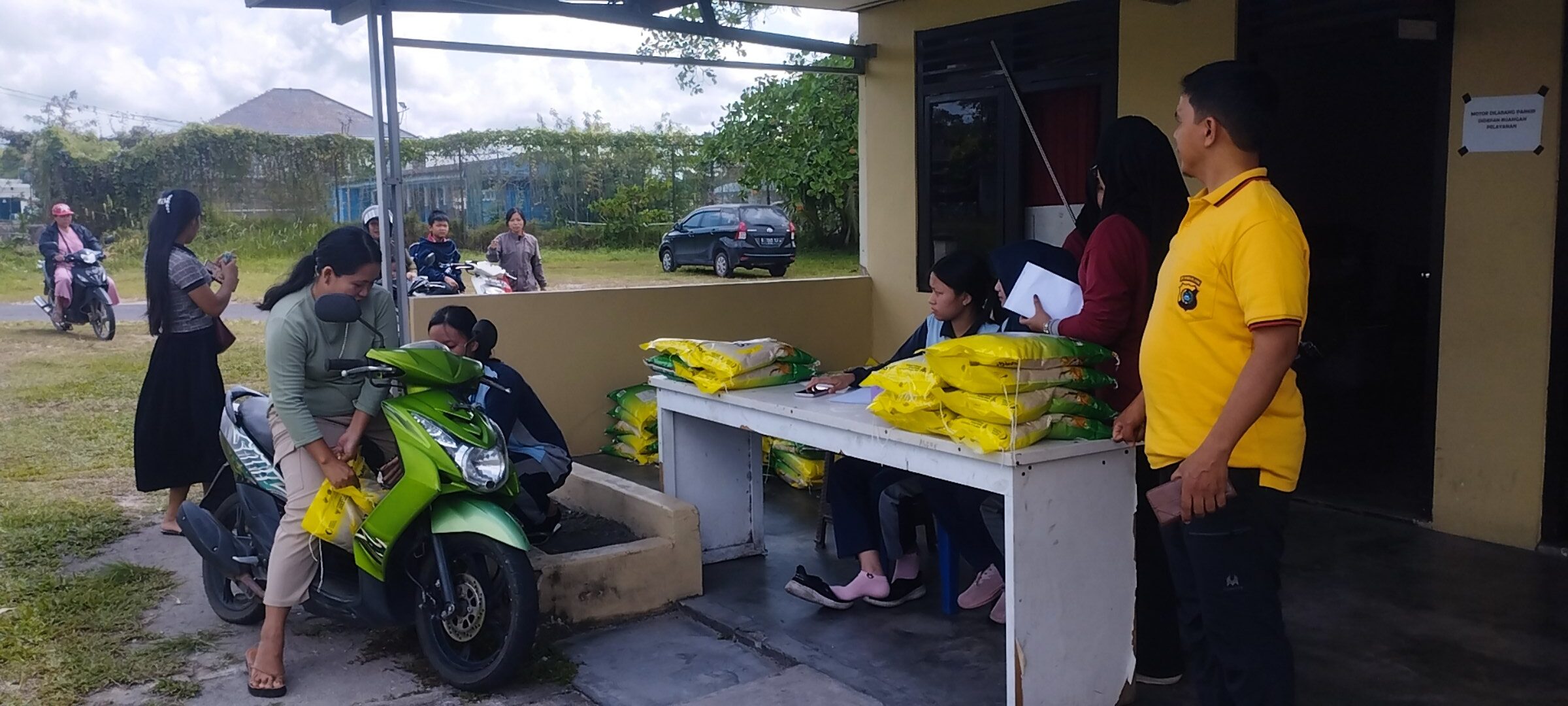 Gerai penjualan beras dilakukan di ruangan unit Binmas Polsek Belinyu, nampak Kanit Binmas Polsek Belinyu Aiptu Zaky Mansubi mempromosikan beras kepada warga yang hendak membeli. (Edho)