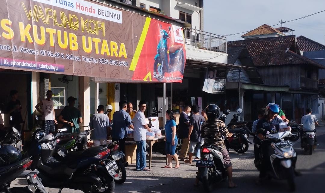 BANGKA — Warung kopi legendaris di Kecamatan Belinyu yaitu Kutub Utara berbagi takjil kepada masyarakat Belinyu, Jum’at (29/03) sore, di warkop kutub utara, di Jalan Veteran Kecamatan Belinyu.